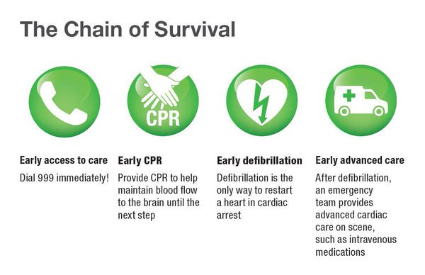 There are more than 30,000 out-of-hospital cardiac arrests in the UK each year, with an overall survival rate of less than 1 in 10! The Sudden Cardiac Arrest Foundation developed the Chain of Survival, shown below, which has been shown to maximize the chance of survival following cardiac arrest. As you will see, it requires the use of a defibrillator. Every minute without cardiopulmonary resuscitation (CPR) and defibrillation reduces the survival by up to 10 per cent.